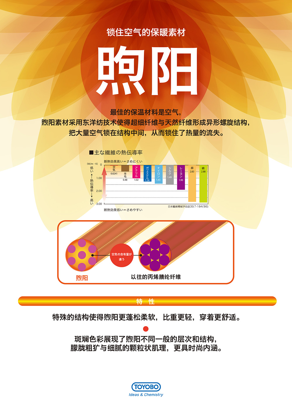 最佳的保溫材料是空氣,煦陽素材采用東洋紡技術使得超細纖維與天然纖維形成異形螺旋結構,把大量空氣鎖在結構中間,從而鎖住了熱量的流失。